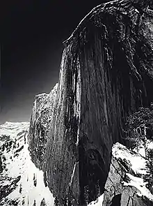 Monolith, the Face of Half Dome is a black and white film photograph taken by Ansel Adams in 1927 that depicts the western face of Half Dome in Yosemite, California. In the foreground of the photo viewers are able to see the texture and detail of the rock, while also the background landscape of pine trees and the Tenaya Peak.[2] Monolith was used by the Sierra Club as a visual aid for the environmental movement, and was the first photograph Adams made that was based on feelings, a concept he would come to define as visualization and prompt him to create the Zone System.[2][3] The image stands as a testament to the intense relationship Adams had with the landscape of Yosemite, as his career was largely marked by photographing the park. Monolith has also physically endured the test of time as the original film negative and glass plate are still intact and printable.[4] The photograph is a part of the portfolio Parmelian Prints of the High Sierras, released in 1927.