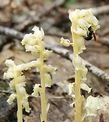 Plants are fleshy and grow 10–35 cm tall. True stems are nonexistent. Instead, the only part which emerges from the soil are unbranched adventitious inflorescences which are developmentally similar to adventitious roots.[2] All parts of the plant are pale yellowish white to reddish-tinged. The bracts are 5–10 mm long scale-like structures, which cover most of the inflorescence. Plants flower from April to December depending on the geographic region (May to October in North America).[3] The flowers are pendulous when young, but become erect when they begin to mature into the fruit which is a capsule. The flowers are 9–12 mm long and produced in a cluster of 1–11 together at the apex of the inflorescence, which is a raceme.[4] It flowers between early summer and mid autumn; plants that flower in summer are yellow and sparsely hairy, while those that flower in autumn are red and densely hairy. These two color "forms" overlap in flowering time. It has been suggested that yellow individuals are largely self-pollinating.[5]