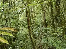 Montane forests differ from lowland forests in the same area.[8] The climate of montane forests is colder than lowland climate at the same latitude, so the montane forests often have species typical of higher-latitude lowland forests.[9] Humans can disturb montane forests through forestry and agriculture.[8] On isolated mountains, montane forests surrounded by treeless dry regions are typical "sky island" ecosystems.[10]