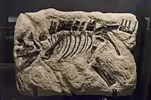 The original type material discovered by Barnum Brown, designated specimen AMNH 5464, included an incomplete skull and mandible (with most of the skull absent), a complete series of eleven cervical, twelve dorsal and eight sacral vertebrae, thirteen complete caudal vertebrae and the centra of two others, several ribs, a complete pelvic girdle except for the right pubis and the distal part of the right ischium, both femora (346mm), the left tibia (355mm), left fibula and left astragalus, the second phalanx of digit three, and the ungual phalanges of the first, third and fourth digits of the left pes (foot).[3] This specimen is housed in the collection of the American Museum of Natural History in New York City, USA.