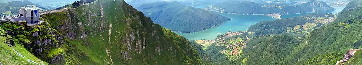 The view from the summit of the mountain encompasses the lakes of Lugano, Como, Varese and Maggiore. To the north are the Alps, stretching from the Matterhorn via the Jungfrau and the Saint-Gotthard Massif to the Bernina Range. To the south are the Lombardy Plains and the Po Valley, with the city of Milan and the Apennine Mountains visible on a clear day.[5]