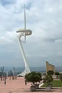 The Montjuïc Communications Tower (Catalan: Torre de Comunicacions de Montjuïc, IPA: [ˈtorə ðə kumunikəsiˈonz ðə muɲʒuˈik]), popularly known as Torre Calatrava and Torre Telefónica, is a telecommunication tower in the Montjuïc neighbourhood of Barcelona, Catalonia, Spain. It was designed by Santiago Calatrava, with construction taking place from 1989 to 1992. The white tower was built for Telefónica to transmit television coverage of the 1992 Summer Olympic Games in Barcelona. The 136-metre (446 ft) tower is located in the Olympic park and represents an athlete holding the Olympic Flame.
