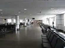 The domestic jetty, which is accessible via security checkpoint A, is divided into two parts: a satellite jetty connected by a tunnel to the main terminal and a wing attached to the main terminal building. The main jetty holds 16 gates: 1 through 12, 15, and 47 through 49. The satellite jetty holds another 10 gates: 17, 19, 21, 23, 25, 27, 28, 30, 32 and 34. There are only two boarding bridges located inside the satellite (17 and 21) as the other gates are mostly used for prop aircraft like the Bombardier Dash 8 family. These parts of the airport are the only departure areas remaining that were part of the original terminal.