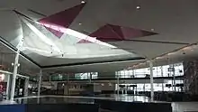 The International jetty, also accessible via the security checkpoint A, is dedicated to flights with destinations outside Canada and United States. This jetty holds 18 gates: 50 through 53 and 55 through 68. Gates 53 and 62 are used exclusively for Passenger Transfer Vehicles. In this area, travellers can shop, eat and relax with a wide varieties of boutiques, restaurants, cafés, spa facilities and one of the biggest airport duty-free shops in Canada. At the far end of the jetty, there is a wide open space with a lot of natural lights through floor to ceilings windows and a big skylight in the rooftop. The masterpiece of the jetty is a work of art, called Veil of Glass, composed of different coloured glass triangles illuminated by spotlights, created by local artist ATOMIC3. Several murals and other works of art are also located in this jetty, including four from various Montréal museums.[34]