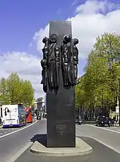 The initial design involved a female Air Raid Warden sheltering children; however, this was simplified until the final design was created.[1] The bronze monument stands 22 feet (6.7 m) high,[4] 16 feet (4.9 m) long and 6 feet (1.8 m) wide.[3] The lettering on the sides replicates the typeface used on war time ration books. There are 17 individual sets of clothing and uniforms around the sides, symbolising the hundreds of different jobs women undertook in World War II and then gave back for the homecoming men at the end of the war.[5] These outfits include uniforms as worn by the Women's Land Army, Women's Royal Naval Service, a nursing cape, a police overall and a welding mask.[1]