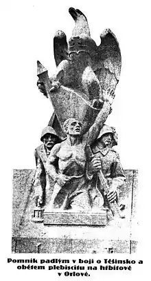 Immediately after the Polish–Czechoslovak War started members of the Sokol in Orlová begun to organize material and financial gatherings to support wounded Czech soldiers and surviving relatives of the Czech soldiers fallen in the war.[1] As gathered finances have accumulated a loose association named "Fund for the survivors and for construction of a monument commemorating fallen for Těšín Silesia with a seat in Orlová" (Czech: Fond pro pozůstalé a pro zbudování pomníku padlým za Těšínsko se sídlem v Orlové) was created.[2] The goal of the Fund was the organisation of welfares the proceeds of which would be used to support families of the fallen soldiers and to maintain graves of the soldiers on the Orlová cemetery.[2]