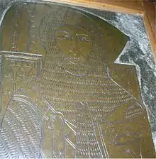 No surviving brasses in England can be dated earlier than the late 13th century. Early examples that do survive include a fragment from the brass to Bishop Thomas de Cantilupe (d. 1282) in Hereford Cathedral; and brasses to Margaret de Camoys (d. 1310) at Trotton, Sussex; Joan de Cobham (c. 1310) at Cobham, Kent; Archbishop William Greenfield (d. 1315) in York Minster; Sir William de Setvans (c. 1323) at Chartham, Kent; and Sir Roger de Trumpington (c. 1326) in Trumpington, Cambridgeshire.[3] The life-sized brass of Sir John d'Aubernon II (d. 1277) at St Mary's Church, Stoke d'Abernon in Surrey has the decorations of the shield filled in with a species of enamel. Other examples of this occur, and the probability is that, in most cases, the lines of the engraving were filled with colouring matter, though brass would scarcely bear the heat requisite to fuse the ordinary enamels.[1] Like three-dimensional effigies of the same period in stone and wood, several early 14th-century military brasses (including those of Setvans, Trumpington and d'Aubernon mentioned above) depict their subjects with crossed legs, but there is no substance to the long-established myth that this pose identifies the deceased as a crusader.[4]