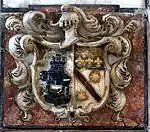 The cenotaph is a tripartite Late Renaissance funerary monument, crowned with a triangular gable. Two putti are resting on the top while the central body is flanked by half figures of veiled and bearded men crossing their arms over their chests. The lower part of the monument is decorated with the cardinal's coats-of-arms between two flat volutes.