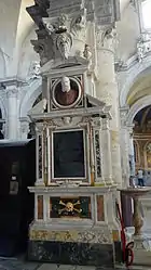 The white marble cenotaph is the work of an unknown artist but attributed to Valsoldo (Giovanni Antonio Paracca).[15] The bust of the cardinal is emerging sharply from the shallow oval niche that is flanked by voluted corbels. His head is uncovered, his ecclesiastical garment plain, and his features are stern and melancholic. The expressivity of the bust bears witness to the artistic power of the sculptor.