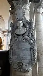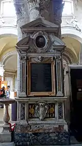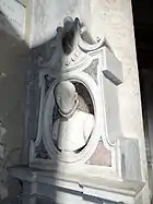 The monument of Stefano Spada, a young nobleman from Lucca who died at the age of 24 years, suffers from its unfavourable location near the first pillar of the Montemirabile Chapel (originally it stood by the counterfaçade). The white marble aedicula was erected sometime after the death of Spada in 1563. It is decorated with the bust of the deceased in an oval niche and the coat-of-arms of the Spada family (two crossed swords). The exquisitely carved bust with the sad, dreaming expression is an excellent example of Renaissance portraiture. The design and construction was attributed to Domenico Poggini by Grisebach but the authorship remains uncertain.[4]