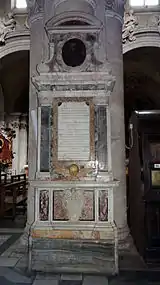 The monument on the last pillar of the north aisle was dedicated to Camilla Buonvisi from Lucca by his husband, Vincenzo Parenzi. It is made of coloured marbles. The stone plaque is decorated with the Parenzi-Buonvisi coat-of-arms in the gable and the skull and crossbones at lower part. There is a winged cherub above the escutcheon. The long inscription states that Parenzi, a consistorial advocate "has lived with her for thirty years in a variety of events, yet without the least breach or interruption of perfect harmony". The noble lady died in 1579 at the age of 53 years.[7]