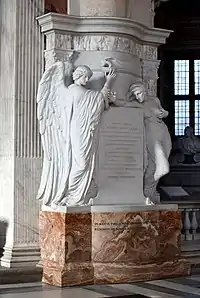 The monument of a Prussian painter, Franz Ludwig Catel was erected by the pillar between the Della Rovere and Cybo Chapels. Catel was a successful landscape and genre painter who spent most of his career in Rome. He lived nearby in Piazza di Spagna where his home became a favourite meeting place for young artists.[8] He died in 1856 at the age of 78 years and left his estate to a foundation which he had set up to help young German and Italian artists in the city. His monument was designed by a fellow German sculptor, Julius Troschel. The white marble Neo-Classical aedicula is decorated with a frieze of garlands and two wreathes and it is crowned by a pediment and a cross. The realistic bust of the deceased is set in a niche in the middle. The epitaph mentions his noble intention to leave most of his fortune to the artists in need.