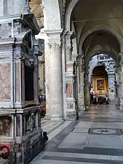 The wall tomb of Cardinal Bernardino Lonati is a monumental Renaissance sepulchre. Like its counterpart in the right transept, the tomb of Lodovico Podocataro, it belongs to the group of monuments from the age of Pope Alexander VI which made the basilica the shrine of the Borgia dynasty at the beginning of the 16th century.
