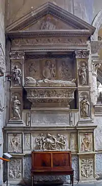 The wall tomb of Cardinal Ludovico Podocataro is a monumental work of Roman Renaissance sculpture. The Cypriot cardinal served as secretary and physician Pope Alexander VI. The prominent humanist and papal diplomat died on 25 August 1504 at the age of 75 in Rome. He was buried in the favourite church of the Borgias on 7 October with great pomp; the funeral oration was given by his secretary, Fedra Inghirami.