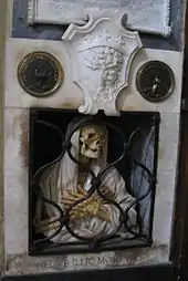 The upper part of the monument is a stone tablet with a long inscription and the portrait of the deceased in a tondo which was painted by a Flemish artist, Jacob Ferdinand Voet. There is a painted canopy which is supported by angels on the wall (one of them holding an hourglass, the symbol of Time). The lower part contains a shrouded skeleton, clutching his breast, as he peers through an iron grill window. The stone frame of the window is decorated with a coat-of-arms and two bronze medallions. The left one shows a tree with its branches cut but sprouting new shoots and containing a caterpillar spinning its cocoon, while the right one shows the metamorphosis of the caterpillar into a moth. These are the symbols of death and resurrection. The inscriptions convey the same message: In nidulo meo moriar ("In my nest I die" i.e. in the city of Rome) and Ut phoenix multiplicabo dies ("As a phoenix I multiply my days"). There are two enigmatic inscriptions on the upper and lower part of the monument: Neque hic vivus and Neque illic mortuus ("Neither living here, nor dead there").