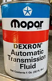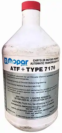 Mopar branded automatic transmission fluids (ATF) have been available for use in Chrysler fully automatic transmissions since 1953. Other Mopar branded fluids for their Fluid Drive semi-automatic transmissions were available as early as 1938. Chrysler used General Motors (GM) automatic transmission fluid specifications from 1952 through 1966 and marketed them under the Mopar brand name. In 1966, Chrysler began releasing their own automatic transmission fluid specifications. Chrysler licenses their ATF specifications[1] to companies which manufacture the fluid and sell it under their own brand names. Not all Chrysler fluids are licensed for reselling under another brand name. All licensed Chrysler fluids must have a license number on the container. If no license number is found, the fluid may not be Chrysler approved and the fluid cannot be guaranteed to meet Chrysler specifications.