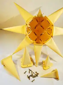 The original Moravian star as manufactured in Herrnhut since 1897 exists only in a 25-point form, composed of eighteen square and seven triangular cone-shaped points.[4] The 26th point is missing and used for mounting. This shape is technically known as an augmented rhombicuboctahedron. Each face of the geometric solid in the middle, the rhombicuboctahedron, serves as the base for one of the pyramid augmentations or starburst points. This is the most commonly seen and most widely available form of Christmas star.