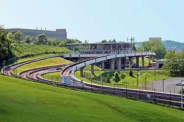 The system connects the university's campuses via five stations (Walnut, Beechurst, Engineering, Towers, Medical) along a 3.6 mi (5.8 km) route.[1] All stations are on sidings, which allows vehicles to bypass stations.