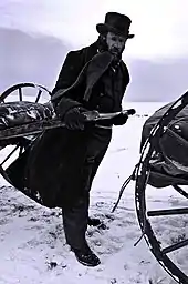 On October 19, the Martin Company was about 110 miles (180 km) further east, making its last crossing of the North Platte River near present-day Casper, Wyoming.[40] Shortly after completing the crossing, the blizzard struck. Many members of the company suffered from hypothermia or frostbite after wading through the frigid river. They set up camp at Red Bluffs, unable to continue forward through the snow. Meanwhile, the original scouting party continued eastward until it reached a small vacant fort at Devil's Gate, where they had been instructed to wait for the rest of the rescue party if they had not found the Martin Company. When the main rescue party rejoined them, another scouting party consisting of Joseph Young, Abel Garr, and Daniel Webster Jones was sent forward. The Martin company remained in their camp at Red Bluffs for nine days until the three scouts finally arrived on October 28. By the time the scouts arrived, 56 members of the company had died. The scouts urged the emigrants to begin moving again. During this interval, the party was met by Ephraim Hanks, bringing meat from a recently slaughtered buffalo, likely saving many lives as the nutritive value of the protein and fat in the meat was much higher than that of the exhausted flour supplies, etc. He also performed many blessings and helped in some amputations, etc. to stop the progression of the frostbite and gangrene that would have otherwise killed more members of the company. Three days later the main rescue party met the Martin Company and the Hodgett and Hunt wagon companies and helped them on to Devil's Gate.[41][42][43]