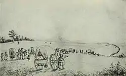 Near Wood River, Nebraska, a herd of bison caused the Willie Company's cattle to stampede, and nearly 30 cattle were lost. Left without enough cattle to pull all of the wagons, each handcart was required to take on an additional 100 pounds (45 kg) of flour.[27]
