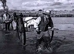 Built to Young's design, the handcarts resembled a large wheelbarrow, with two wheels five feet (1.5 metres) in diameter and a single axle four and a half feet (1.4 m) wide, and weighing 60 pounds (27 kg). Running along each side of the bed were seven-foot (2.1 m) pull shafts ending with a three-foot (0.9 m) crossbar at the front. The crossbar allowed the carts to be pushed or pulled. Cargo was carried in a box about three feet by four feet (0.9 m by 1.2 m), with 8 inches (0.20 m) walls. The handcarts generally carried up to 250 pounds (110 kg) of supplies and luggage, though they were capable of handling loads as heavy as 500 pounds (230 kg). Carts used in the first year's migration were made entirely of wood ("Iowa hickory or oak"); in later years a stronger design was substituted, which included metal elements.[10][11][12]