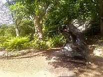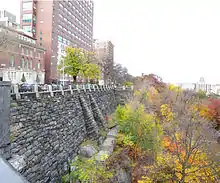 Morningside Park's distinctive natural geography is a rugged cliff of Manhattan schist rock.[158][159] The geology is similar to that of Central Park and contains, from top to bottom: Manhattan schist, metamorphosed sedimentary rock; Lowerre quartzite, a metamorphosed rock; Inwood marble, metamorphosed limestone which overlays the gneiss; and Fordham gneiss, an older deeper layer.[159] A large rock formation of Manhattan schist in the park is a visible sign of the bedrock below much of lower and northern Manhattan.[160] Rock outcroppings are prevalent in Morningside Park and nearby Central Park, Marcus Garvey Park, and Riverside Park.[161] Besides the cliff, one large geological feature remains is a glacial groove located at 121st Street,[162][163] which had been noted as early as 1916.[164] The western border of the park between 122nd and 123rd Streets is taken up by PS 36, located on a rock drop off; this occupies the former site of the ruins of Blockhouse No. 4, which was used as a source of stone until the park's creation. A tablet was placed on the site by the Women's Auxiliary of the American Scenic and Historic Preservation Society in 1904; part of the cliff was destroyed in 1915.[165][163]