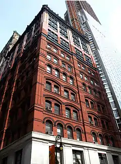 The Morse Building stands 180 feet (55 m) tall with 14 stories[6] and is one of the oldest remaining fireproof skyscrapers in New York City.[7] Benjamin Silliman Jr. and James M. Farnsworth designed the Morse Building's lowest eight stories, built between 1878 and 1880.[8][9][10] The structure was the firm's first major project in New York City;[11][12] the firm had designed the Morse Building as a 10-story structure, but the top two stories were subsequently rebuilt.[13][lower-alpha 1] The upper six stories were designed by William P. Bannister and Richard Montgomery Schell and built from 1901 and 1902.[10][13][15] The building's original design was inspired by the Victorian Gothic, Neo-Grec, and Rundbogenstil styles. The Morse Building's corner location allowed it to have two full facades: the southern elevation on Beekman Street and the western elevation on Nassau Street.[16][17] The design of the Morse Building contrasts with that of the Temple Court Building (now 5 Beekman Street) and Potter Building, from the same architects.[16]