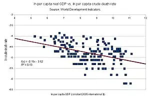In more recent times, higher mortality rates have been less tied to socio-economic levels within a given society, but have differed more between low and high-income countries. It is now found that national income, which is directly tied to standard of living within a country, is the largest factor in mortality rates being higher in low-income countries.[26]