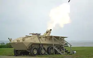 The 2R2M is a derivative of the MO-120-RT designed to be carried on light armoured vehicles, with a semi-automatic loading.[4] It is in service in 5 armies and is currently being integrated in the new French Scorpion GRIFFON wheeled vehicle (MEPAC).