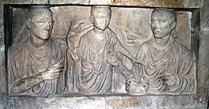The distinctive social relationship of ancient Rome was that between patron (patronus) and client (cliens). Although the obligations of this relationship were mutual, they were also hierarchical. The relationship was not a unit, but a network (clientela), as a patronus might himself be obligated to someone of higher status or greater power, and a cliens might have more than one patron, whose interests might come into conflict. If the familia was the discrete unit underlying society, these interlocking networks countered that autonomy and created the bonds that made a complex society possible.[5] Although one of the major spheres of activity within patron-client relations was the law courts, patronage was not itself a legal contract; the pressures to uphold one's obligations were moral, founded on the quality of fides, "trust" (see Values below), and the mos.[6] Patronage served as a model[7] when conquerors or governors abroad established personal ties as patron to whole communities, ties which then might be perpetuated as a family obligation. In this sense, mos becomes less a matter of unchanging tradition than precedent.[8]