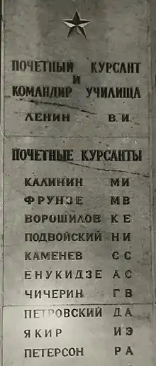 The school's cadets are also known as the Kremlin Cadets or the Kremlovtsy. In honor of its 1917 establishment and status as the oldest officer cadet school in Russia, since 1967 it has been the final school and military unit to mark the end of military parades in Moscow's Red Square. During the Moscow Victory Day Parade, members of the school also take part in the historical part.[3] It also maintains privilege, granted in the 1920s, to hold graduation and commissioning parades there. From 1924 to 1935, the Corps of Cadets mounted guards of honour (No.1 Sentry) at Lenin's Mausoleum by orders of the All-Russian Central Executive Committee. In addition to Lenin, individuals honored as honorary cadets by the school were Mikhail Kalinin, Mikhail Frunze, Kliment Voroshilov, Nikolai Podvoisky, Sergey Kamenev, Avel Yenukidze, Georgy Chicherin, David Petrovsky, and Iona Yakir.