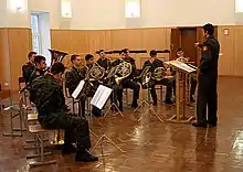 The school maintains a Marching Band (Russian: Марширующий оркестр) that is employed in ceremonial events hosted by the college, mostly made up of the musicians of the training band wing. The Suvorov College Band performs at the country's leading venues, including the Great Hall of the Moscow Conservatory, the Moscow International House of Music, and the State Kremlin Palace.[3] The central training band wing of the college plays not only in Russia, but also in military tattoo events in Switzerland, Germany, France, Italy, England, Poland, and the Czech Republic. It has been a regular participant in the Spasskaya Tower military tattoo festival since 2006.[4] Its mission is to train young boys inclined to serve the Army and Air Force as bandsmen, conductors and band drum majors.
