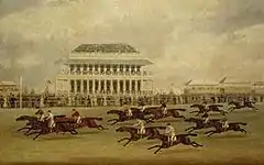 On 23 May at Epsom Moses started 6/1 third favourite in a twelve-runner field for the Derby, with Hampden being made the 3/1 favourite. The early running was made by an outsider named Wanton who led until the turn into the straight but then veered off the course and into the crowd. The closing stages were disputed by Moses, Hamden, Figaro and an unnamed "brother to Antonio". After a "most desperate struggle", Moses, ridden by Thomas Goodisson, won by half a neck from Figaro, with Hampden a length away in third.[10] Wearing the colours of the Duke of York in the race,[11] Moses gave the Duke his second victory, and the third for the royal family, at the Derby.[4] The race was described in a contemporary source as "the best Derby ever run."[12]