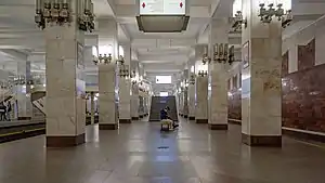 Moskovskaya (Russian: Московская) is a station on both Line 1 and Line 2 line of the Nizhny Novgorod Metro. It was one of the first six stations to open on the line on 20 November 1985.[1][2] It is also the only station that permits transfers from one line to the other. Passengers may also transfer to the main Nizhny Novgorod railway station. Also, the metro station Moskovskaya is a transfer hub to the station of the City Rail Nizhny Novgorod-Moskovsky.