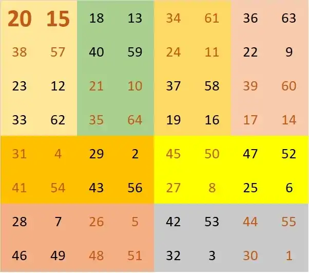- Each 2×2 subsquare, including wrap-round, sums to s/k, where s = n(n2 + 1)/2 is the magic sum.