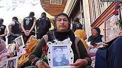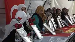 The Mothers of Diyarbakır (Turkish: Diyarbakır Anneleri) is a group who gathers daily for a sit-in protest against the Peoples' Democratic Party (HDP), demanding the return of their children who allegedly were deceived or kidnapped by the Kurdistan Workers' Party (PKK).[1][2] The sit-in takes places outside the Diyarbakır headquarters of the HDP.[3] In contrast to the Saturday Mothers in Istanbul, who also ask for the whereabouts of their relatives and whose protests face oppression from the police,[4][5] the Mothers of Diyarbakır group are supported by the Turkish police[6] who escort them home in the evenings,[5] and are protected by the local state prosecutor.[7] The pro-government media also support the group.[4]