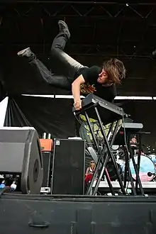 The band's musical style is widely recognizable by its unique blend of pop punk with the Moog synthesizer. The usage of the Moog stems from Cain, who first heard the instrument employed on the Rentals' album Return of the Rentals (1995). He subsequently bought a cheap Moog at a pawn shop and wanted it to be an integral part of Motion City upon their formation.[8] Johnson became known for his signature "Moogstand" in live performances, which consisted of a handstand on the instrument.[8] The group has been widely attributed to a number of different genres, including pop rock,[33] power pop,[1] indie rock,[85] emo,[71] and pop punk.[1] Joshua Cain dismissed this latter label, remarking, "I definitely wouldn't consider us a pop-punk band. Our influences are more based on '90s bands like Superchunk and early Weezer."[86] Pierre characterized the band's music as "dirty, fast, happy, emotional rock songs."[33]