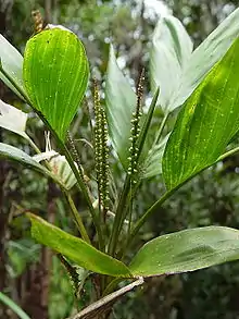 The high altitude and rainfall of the mountain create conditions for a number of vegetation types growing on the poor granitic soils.[7] The lower slopes support lowland tropical rainforest (complex mesophyll vine forest) with a great diversity of large leaved trees, climbers, epiphytes, palms and ferns. With increasing elevation the rainforest changes to a less diverse smaller leaved notophyll type. At elevations above 1000 m, simple microphyll vine fern forest is found with species such as the purple kauri pine (Agathis atropurpurea), Elaeocarpus ferruginiflora and pimple bark (Balanops australiana). With further increases in altitude, increasing exposure and cloud contact create conditions ideal for the formation of cloud forest (simple microphyll vine fern thicket); many of the species are rare or endemic and most trees are shrouded in mosses and other bryophytes.[8]