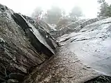 The mountain is largely composed of 400-million-year-old schist and quartzite rock primarily associated with the Devonian Littleton Formation, which extends south into Massachusetts and north into the White Mountains.[16] At lower elevations on the mountain, and stratigraphically below the Littleton Formation, the bedrock is from the Silurian period, consisting of Rangeley Formation schists, Perry Mountain Formation quartzites, the Francestown Formation granulite, and the Warner Formation granulite. Structurally, the mountain is part of an overturned syncline – called a fold nappe – that was caused by the compressional forces of the Acadian orogeny. Dramatic small- to medium-scale metamorphic folds are visible on many of the rock faces of the mountain, including the famous Billings Fold (a recumbent syncline found about 450 feet (140 m) west of the summit), shown in the 1942 edition of Marland P. Billings' Structural Geology.[17] In addition to impressive folds, the Devonian Littleton Formation shows large pseudomorphs of sillimanite after andalusite that occur as 4-inch-long (102 mm) "turkey tracks".[5]