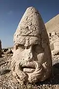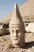 The mountain lies 40 km (25 mi) north of Kahta, near Adıyaman. In 62 BC, King Antiochus I Theos of Commagene built on the mountain top a tomb-sanctuary flanked by huge statues 8–9-metre high (26–30 ft) of himself, two lions, two eagles and various Greek and Iranian gods, such as Heracles-Artagnes-Ares, Zeus-Oromasdes, and Apollo-Mithras-Helios-Hermes.[1][2] These statues were once seated, with names of each god inscribed on them. The heads of the statues at some stage have been removed from their bodies, and they are now scattered throughout the site.