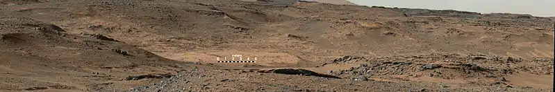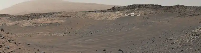 On August 6, 2012, Curiosity (the Mars Science Laboratory rover) landed in "Yellowknife" Quad 51[3][4][5][6] of Aeolis Palus,[7] next to the mountain. NASA named the landing site Bradbury Landing on August 22, 2012.[8] Aeolis Mons is a primary goal for scientific study.[9] On June 5, 2013, NASA announced that Curiosity would begin an 8 km (5.0 mi) journey from the Glenelg area to the base of Aeolis Mons. On November 13, 2013, NASA announced that an entryway the rover would traverse on its way to Aeolis Mons was to be named "Murray Buttes", in honor of planetary scientist Bruce C. Murray (1931–2013).[10] The trip was expected to take about a year and would include stops along the way to study the local terrain.[11][12][13]
