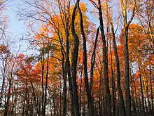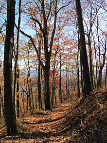 Mount Sterling crowns Mount Sterling Ridge, a 7-mile (11 km) ridge that gradually descends northward from the flanks of Big Cataloochee Mountain (on the Balsam Mountain crest) to the Pigeon River Valley. The ridge divides the Cataloochee area to the east from the Big Creek Valley (which represents the fringe of the Cosby area) to the west. The community of Waterville, North Carolina is located in the Pigeon Valley at the ridge's northern extreme. Geologically, Mount Sterling consists mainly of Precambrian metamorphic sandstone of the Ocoee Supergroup, formed nearly a billion years ago from ancient ocean sediments.[3] The summit of Mount Sterling is surrounded by a stand of Southern Appalachian spruce-fir forest.