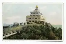 In 1897 the Holyoke Street Railway Company began constructing the Mount Tom Railroad, as well as what would become known as "Mountain Park", a trolley park and later an amusement park on the east side of the mountain. The project changed hands several times until its closure in 1988 when competition from larger amusement parks gradually sapped business away from what had become affectionately known by local residents as "The Queen of the Mountain".[4][5] The Mount Tom Summit House was also constructed on the cliffs of Mount Tom in 1897, but it burned three years later. Subsequently, rebuilt, by 1902, the property became the first parcel of the Mount Tom State Reservation, however this second house also burned in 1929, in part due to a series of failures in its water systems. The original foundation was not used again, however days later it was decided a much cheaper and smaller sheet metal structure would be built adjacent to it, housing a restaurant and souvenir stand. Because of its construction and lack of grandeur however, it remained unpopular, with one local patron, Katherine Root, remarking "the wind sounded like thunder when it roared through the building and it rattled constantly"; it was ultimately dismantled a year after the railroad, in 1939.[6] The ruins of the old summit house foundations remain prominent structures, visible on the mountainside today. In 1933 the Civilian Conservation Corps assisted with the construction of reservation structures and park roads; their work also remains visible today.