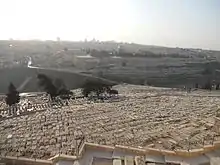 The Mount of Olives or Mount Olivet (Hebrew: הַר הַזֵּיתִים, Har ha-Zeitim; Arabic: جبل الزيتون, الطور, Jabal al-Zaytun, Al-Tur) is a mountain ridge east of and adjacent to Jerusalem's Old City.[1] It is named for the olive groves that once covered its slopes. The southern part of the Mount was the Silwan necropolis, attributed to the ancient Judean kingdom.[2] The mount has been used as a Jewish cemetery for over 3,000 years and holds approximately 150,000 graves, making it central in the tradition of Jewish cemeteries.[3]