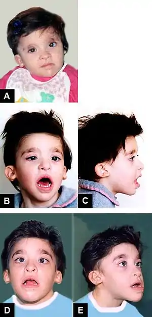 This autosomal dominant disorder is characterized by a number of health defects including Hirschsprung's disease, intellectual disability, epilepsy,[3] delayed growth and motor development, congenital heart disease, genitourinary anomalies and absence of the corpus callosum. However, Hirschsprung's disease is not present in all infants with Mowat–Wilson syndrome and therefore it is not a required diagnostic criterion.[4] Distinctive physical features include microcephaly, narrow chin, cupped ears with uplifted lobes with central depression, deep and widely set eyes, open mouth, wide nasal bridge and a shortened philtrum.