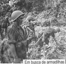 It was not until 1965 that recruitment of fighters increased along with popular support, and the strike teams were able to increase in size. The increase in popular support was in part due to FRELIMO's offer of help to exiled Mozambicans, who had fled the conflict by travelling to nearby Tanzania.[35] Like similar conflicts against the French and United States forces in Vietnam, the insurgents also used landmines to a great extent to injure the Portuguese forces, thus straining the armed forces' infrastructure[70] and demoralising soldiers.[35]