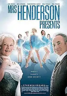 Mrs Henderson Presents is a 2005 British-American biographical musical film directed by Stephen Frears and written by Martin Sherman. It stars Judi Dench, Bob Hoskins, Kelly Reilly, and Will Young (in his acting debut). It tells the true story of Laura Henderson, an eccentric British socialite who opened the Windmill Theatre in London in 1931.