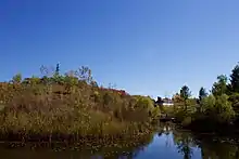 The creek enters into the Don River valley at the Don Valley Brick Works, where its flow bifurcates through or adjacent to the ponds, and then re-converges shortly before exiting into the Don River south of Bayview Avenue.[11] The ponds serves to hold and provide biological filtration for the inflow from Mud Creek prior to discharge into the Don River, and is part of Toronto storm-water management strategy.[15] Due to the geology and depth of the ravine, erosion and foresting work has been ongoing to preserve its integrity as well as the Beltline Trail that runs through it.[16]