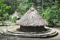 The houses of the Muisca, called bohíos or malokas, were circular structures made of poles of wood and walls of clay, with a conical reed roof. A long beam of wood supported the roof in the centre of the round structure and was attached to the wooden poles. The interior of the roof was decorated with cloths with thin strokes of different colours. On the floor fine straw was placed.[6] Some bohíos, probably those of the caciques had ceramic floors, as evidenced by findings in Mosquera. This was atypical for the Muisca houses.[7]