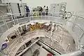 The high bay is certified for the processing of hazardous materials such as high-pressure gasses, hypergolic propellant, ammonia, oxygen, and fluorocarbons.[4] It has a usable floor space of 40 m × 18 m (132 ft × 60 ft) with a ceiling height of 19 m (62 ft).[3][5] It is equipped with an 18 t (20 short tons) bridge crane with a hook height of 15 m (49 ft) and a 12.2 m × 9.1 m (40 ft × 30 ft) vertical door.[5] The low bay has a usable floor space of 10 m × 10 m (34 ft × 34 ft) with a ceiling height of 6.1 m (20 ft).[3] Both the high bay and low bay are class 100,000 cleanrooms.[6]